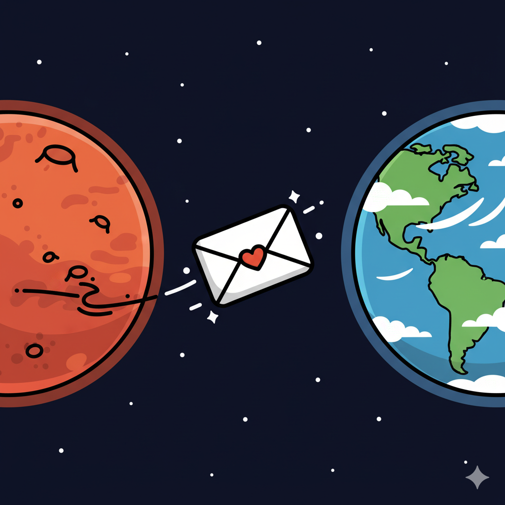 想像そうぞうしてみて。とおくにいるおともだちに、のひらサイズのレーザーポインターで「こんにちは!」って送るくらいむずしいんだ。地球ちきゅう宇宙船うちゅうせん一緒いっしょどういているし、ひかりはやいけど何分なんふんもかかる距離きょりだから、NASAの科学者かがくしゃたちは特別とくべつ照準しょうじゅん装置そうちでぴったりねらいってレーザーを送ったんだ。